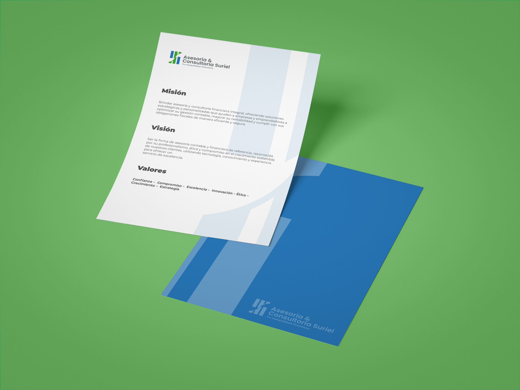 Asesoría & Consultoría Suriel necesitaba un logotipo que representara sus valores centrales: compromiso, confianza y crecimiento, y que transmitiera seguridad a sus clientes en temas tan sensibles como las finanzas personales y empresariales.